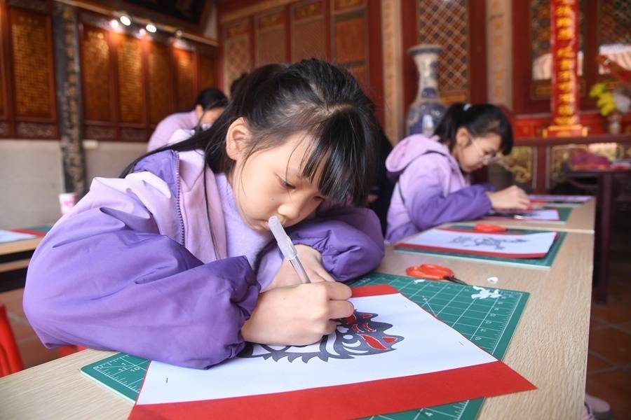 在泉港区后龙镇涂坑古民居刘氏宗祠内,孩子们正在进行年画剪纸体验
