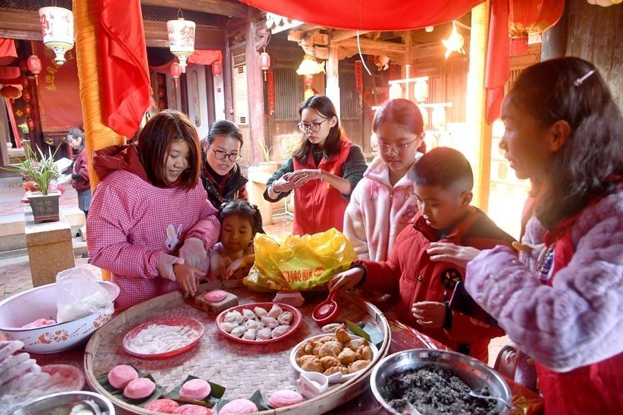 在泉港区后龙镇涂坑古民居百万大厝内,志愿者们带领大家体验红团、口酥制作过程